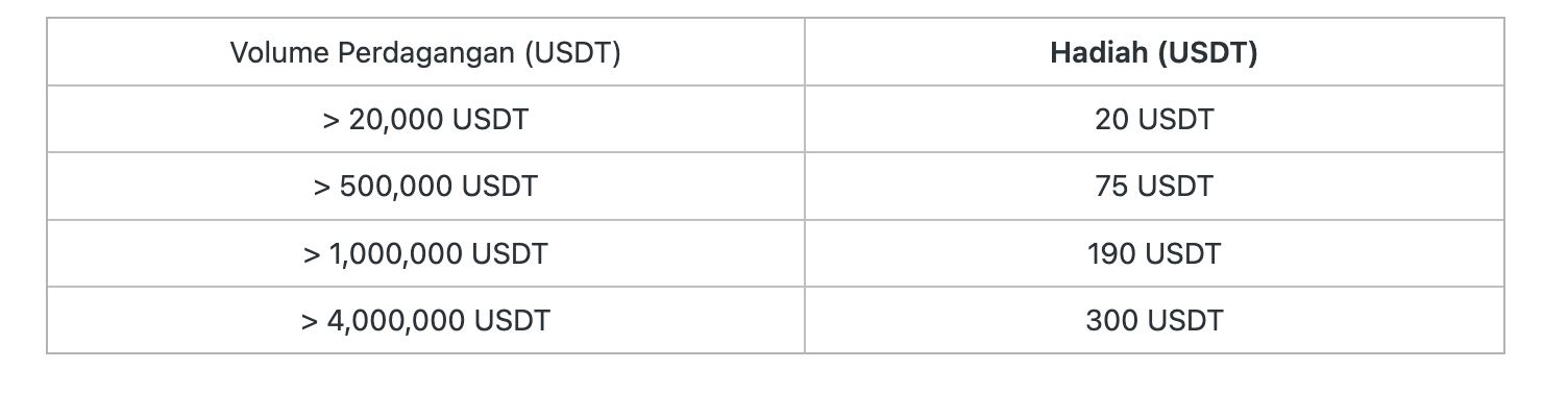 Selama acara, capai berbagai tingkat volume perdagangan dan dapatkan bonus sesuai dengan tingkat tertinggi yang dicapai!