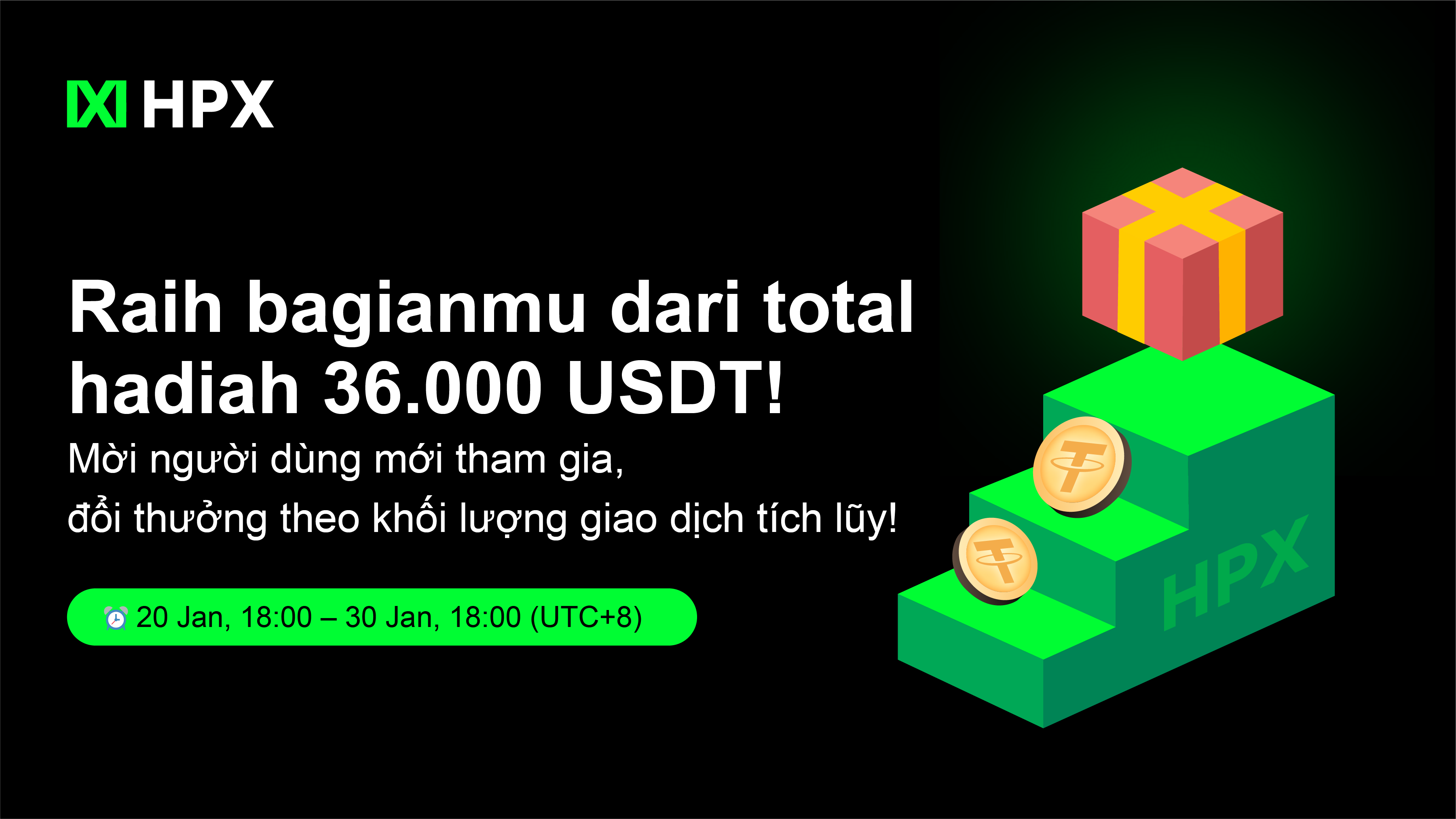 - Batasan Acara: Sesuai dengan hukum dan peraturan yang berlaku, pengguna dari wilayah seperti Tiongkok Daratan, Kuba, Iran, Korea Utara, Suriah, dan Krimea tidak dapat berpartisipasi dalam acara ini.Announcement:HPX’s Commitment to International Compliance Operations