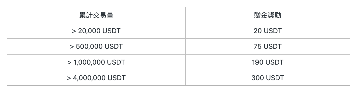 活動期間內,累計合約交易量達到不同階梯,即可按最高等級領取贈金!